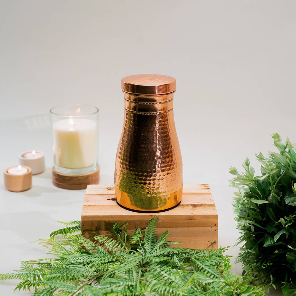 Denne særlige håndlavede karaffel med låg er lavet af rent kobber (låget kan også bruges som kop). Bemærk: koppens låg på denne karaffel sidder løst og lukker derfor ikke vandtæt. Karaflen er derfor ikke beregnet til at tage med.