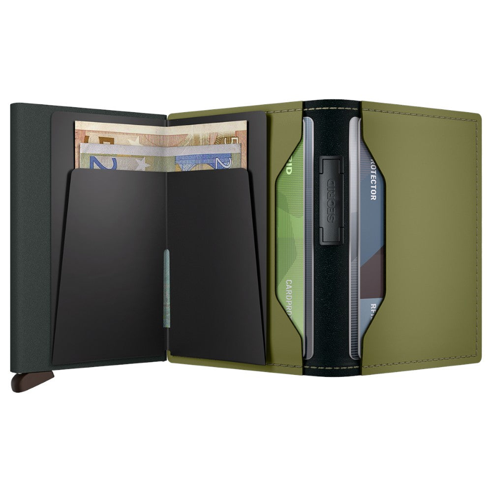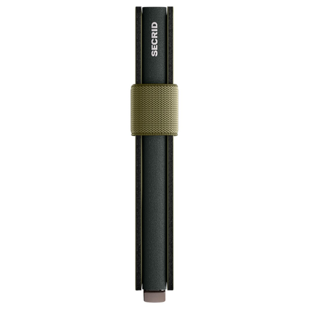 Denne bandwallet er en mini wallet med elastisk bånd udenom - etuiet er grønt med et armygrønt bånd og cardprotectoren er sort.