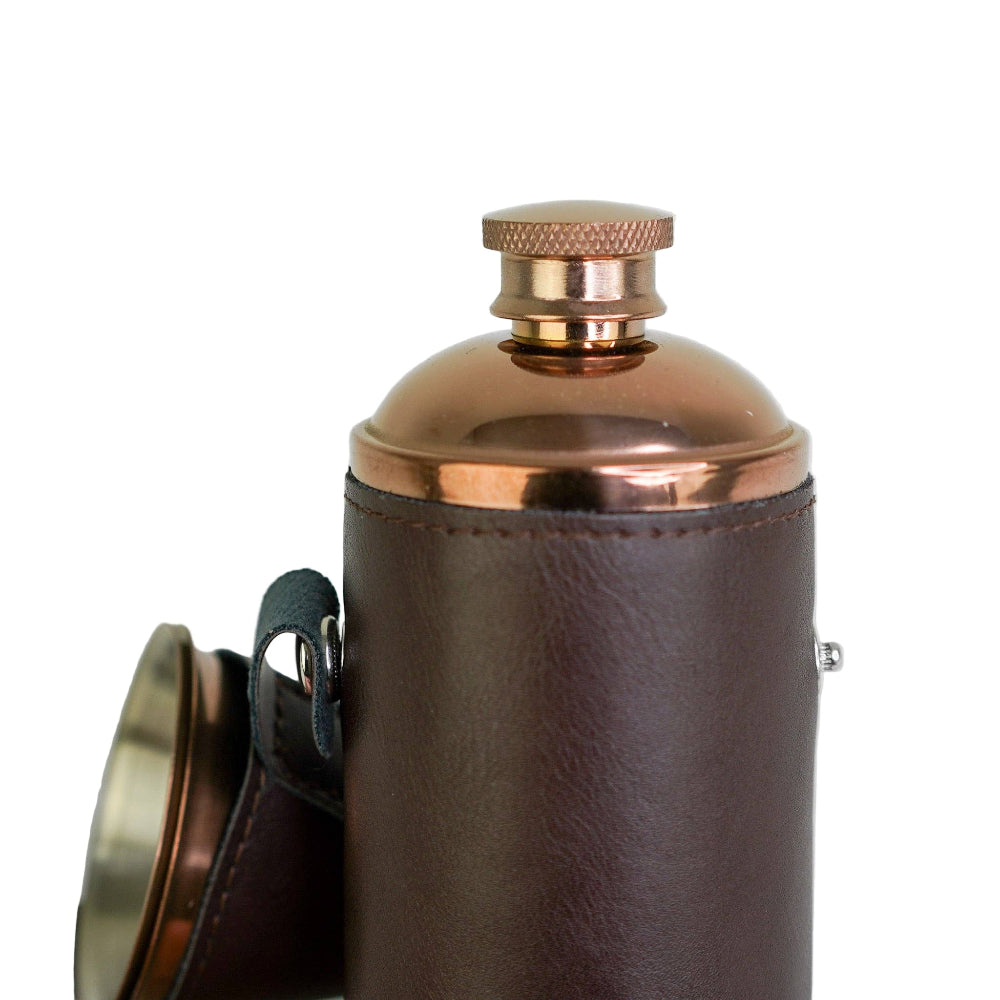 Vores 8 oz Copper Hunters Hip Flask eller Lommelærke er lavet af førsteklasses materialer med kobberfinish, denne lommelærke flaske rummer 8 flydende ounces og er pakket ind i en dybbrun PU-læderbeklædning. Med 2 kopper inkluderet.