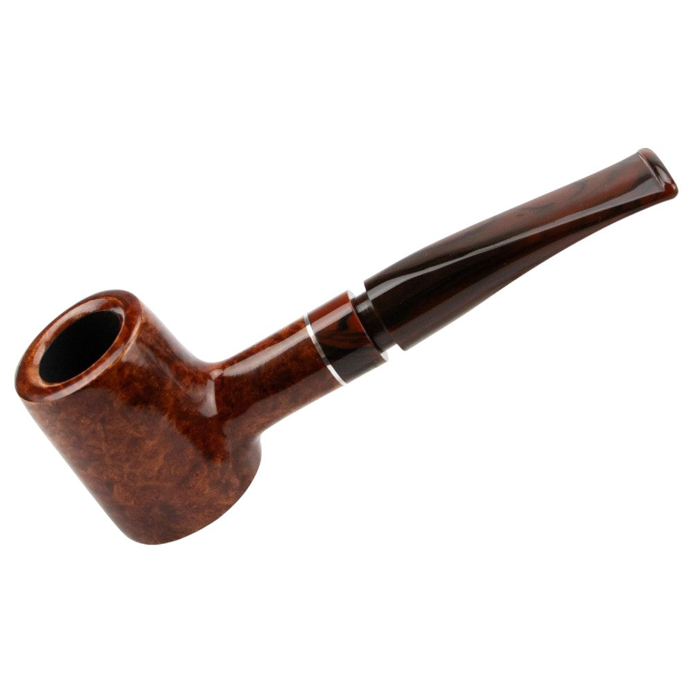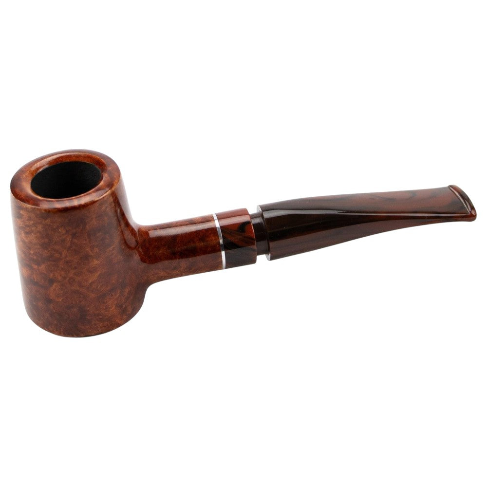 "Terenzi"-kollektionen af Cesare Barontini fås i seks forskellige former. Det lyse akrylmundstykke giver en smuk kontrast til den varme, rødbrune pibeskål. Den diskrete fordybning og den smalle sølv ring tilføjer et moderne præg og fremhæver pibens elegante stil.