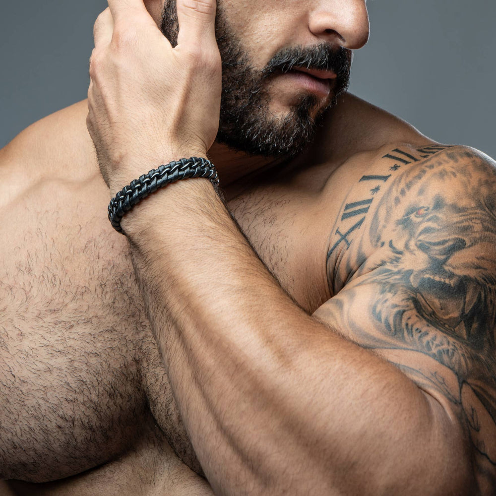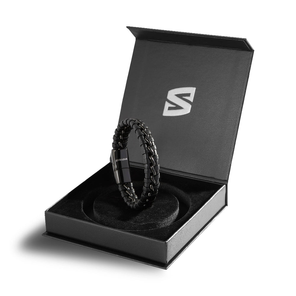 Serasarin maskuliininen punottu rannekoru mustaa lehmännahkaa