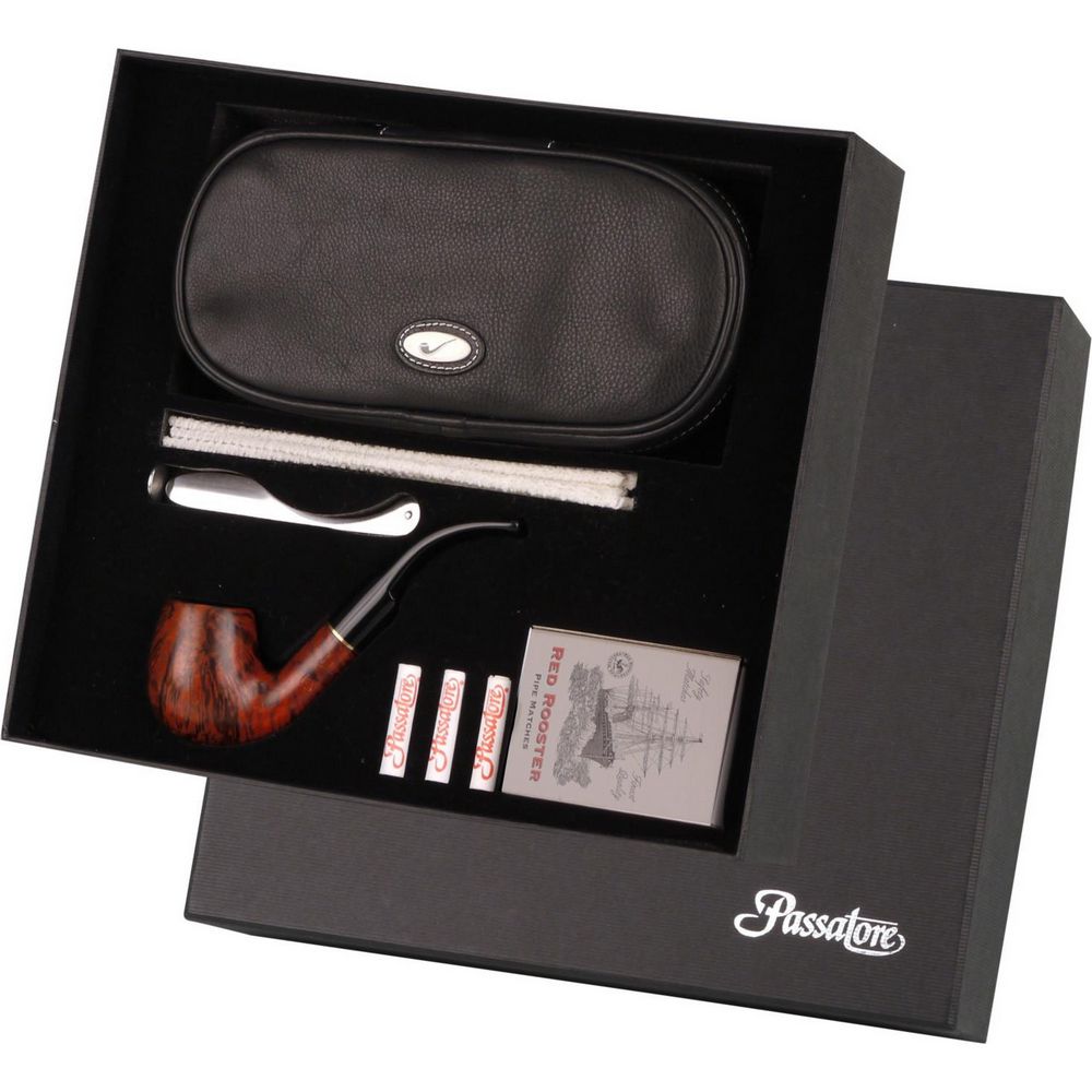 Dette førsteklasses Passatore-gavesæt er dog ikke kun for begyndere. Piben er fremstillet af udvalgt bruyeretræ fra den veletablerede italienske pibeproducent Passatore og vil også glæde passionerede piberygere. Det elegante pibeetui, lavet af ægte læder, har attraktive beige syninger og et metalemblem og vil give mange års glæde.